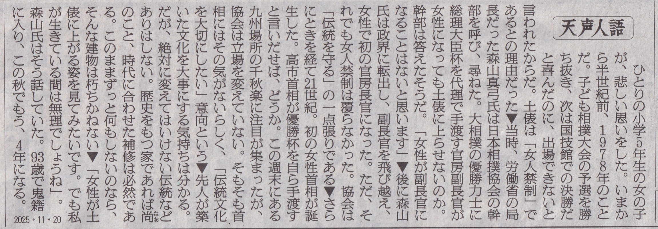 女性差別の問題は根深く、難しいというのは、今日のこの朝日新聞の「天声人語」を読んで、改めて考えさせられた。