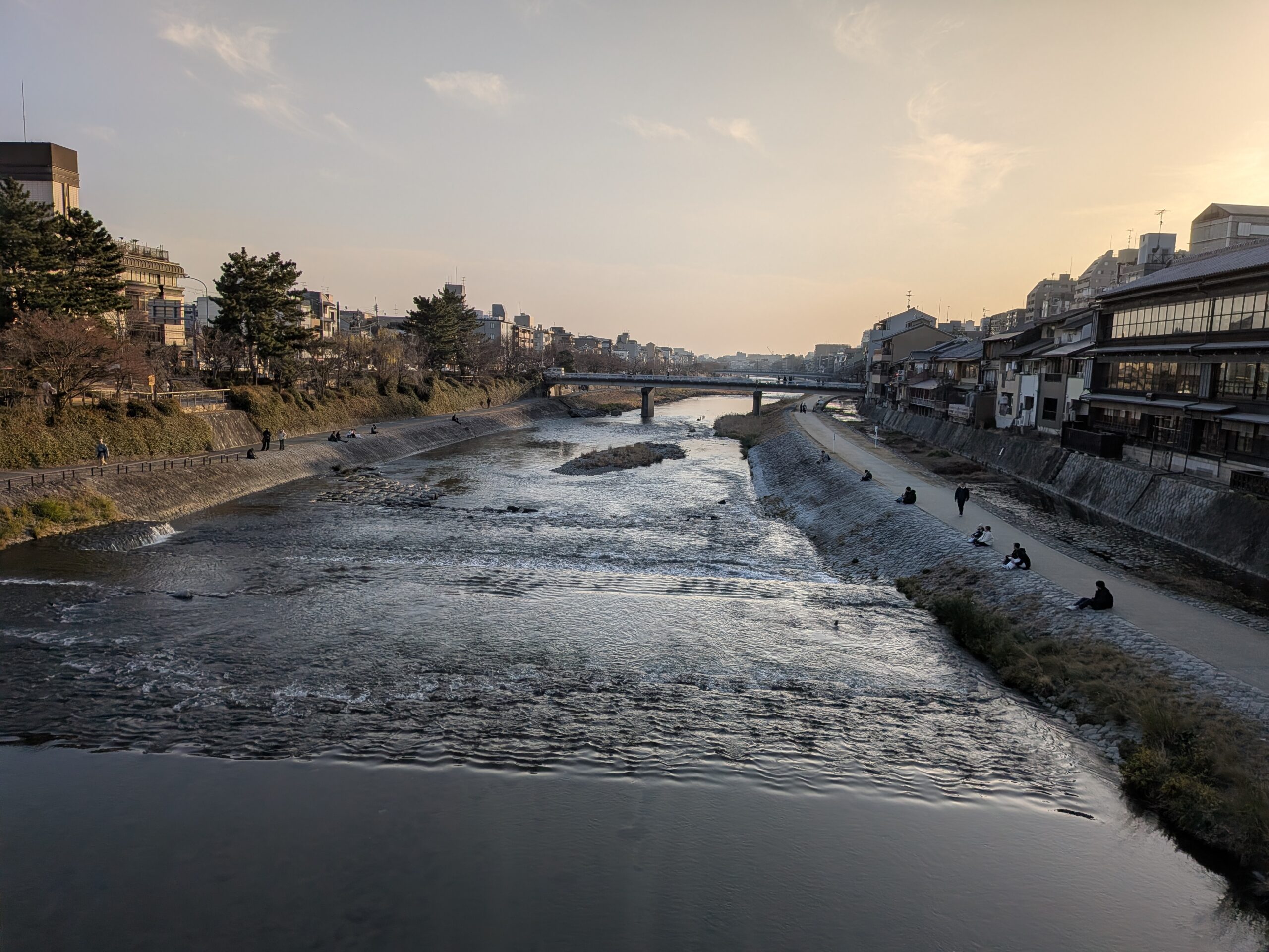 帰りに四条大橋から鴨川を南側に写してみました。何とも言えない夕暮れですね。子どもの頃、高校生くらいまでは京都にとても強い憧れのようなものがありました。でも、まさか自分が京都に住みことになるとは思いませんでした。勿論、地元の人には「伏見は京都じゃない」と言われるのでしょうけれど、京都の外れギリギリの辺りでも、京都だと地方出身者には思えるものです。