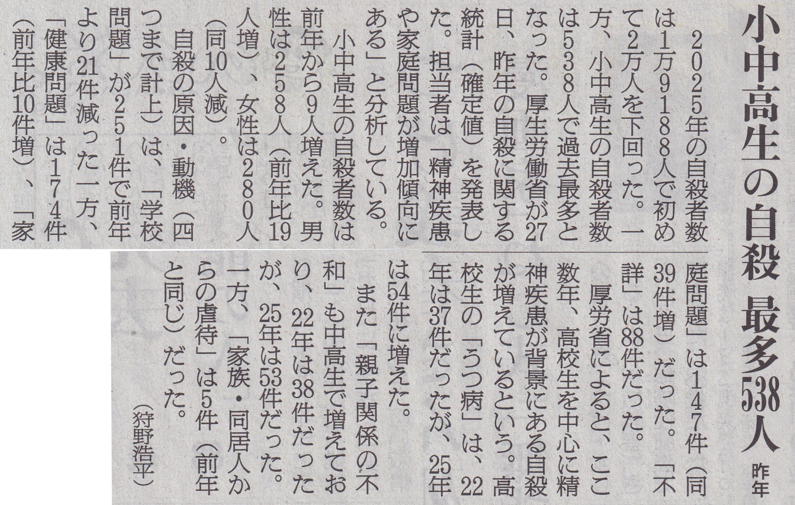 「精神疾患」とか「うつ」とか言うのをもうやめてほしいように思う。こんなものは病気でも、原因でもない。それらは単なる症状でしかない。根本的な原因は、社会にあり、家庭環境にあり、人間関係にあり、学校のあり方そのものにあるのではないだろうか。