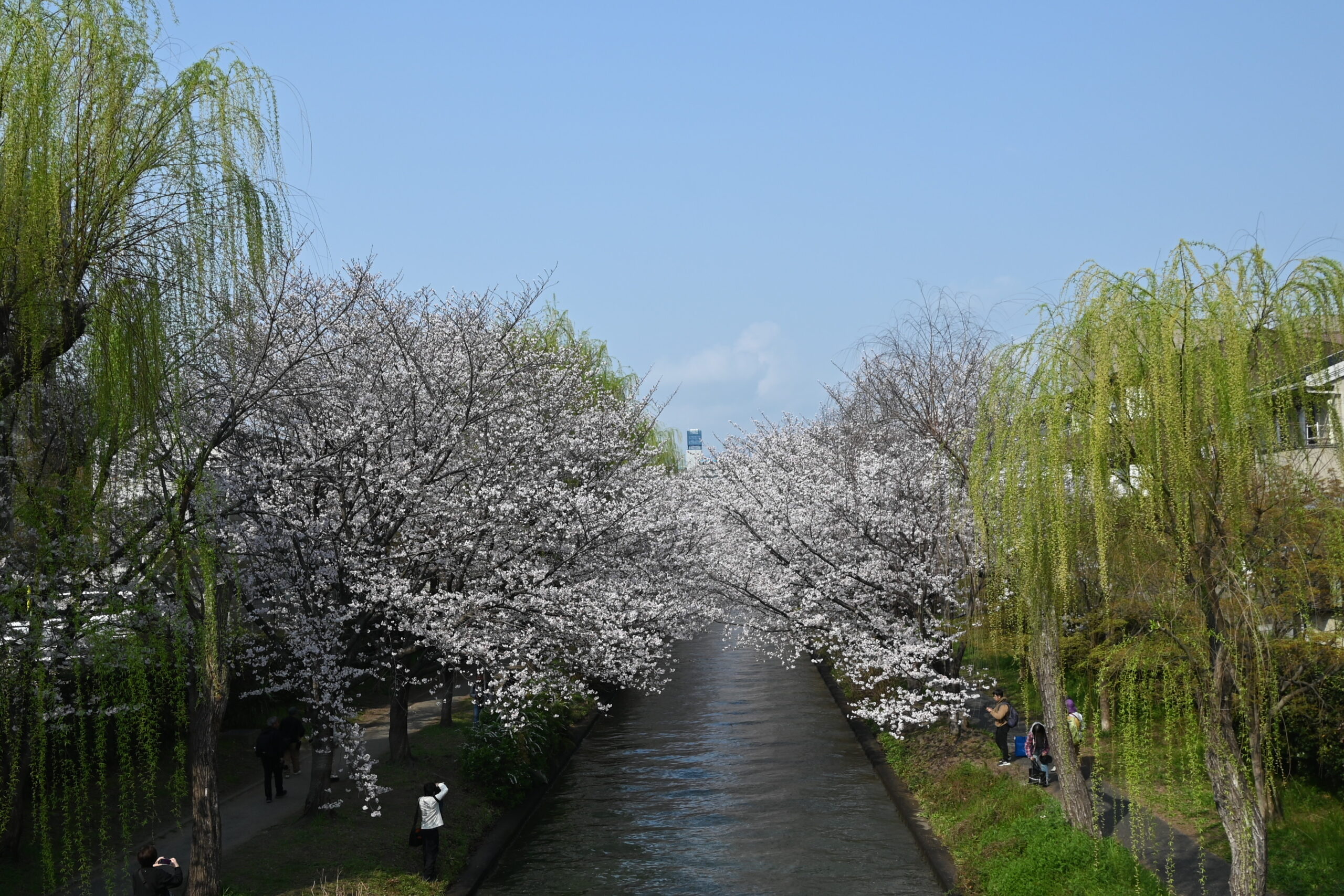 まだ、五分か七分くらいだと思いますが、見頃で~す。柳の緑と桜の桃色と空の空色のコントラストが美しいです。朝なので、人はまだ少なかったようですが、昨日は日曜日でいっぱいでした。