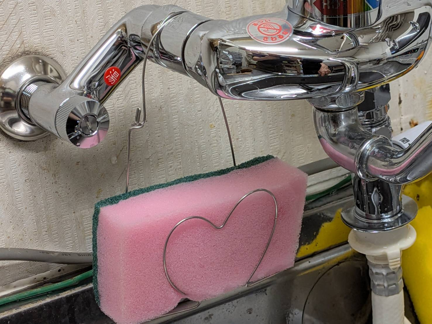 妻に頼まれて、スポンジをぶら下げる所を作ってほしいとのことで、昔取った杵柄ということで、針金細工で作ってみました。どうでしょうか?