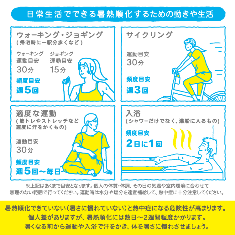 何でも「汗をかく」というのが、大切なように聞きました。暑熱順化とは「汗をかく練習」みたいです。