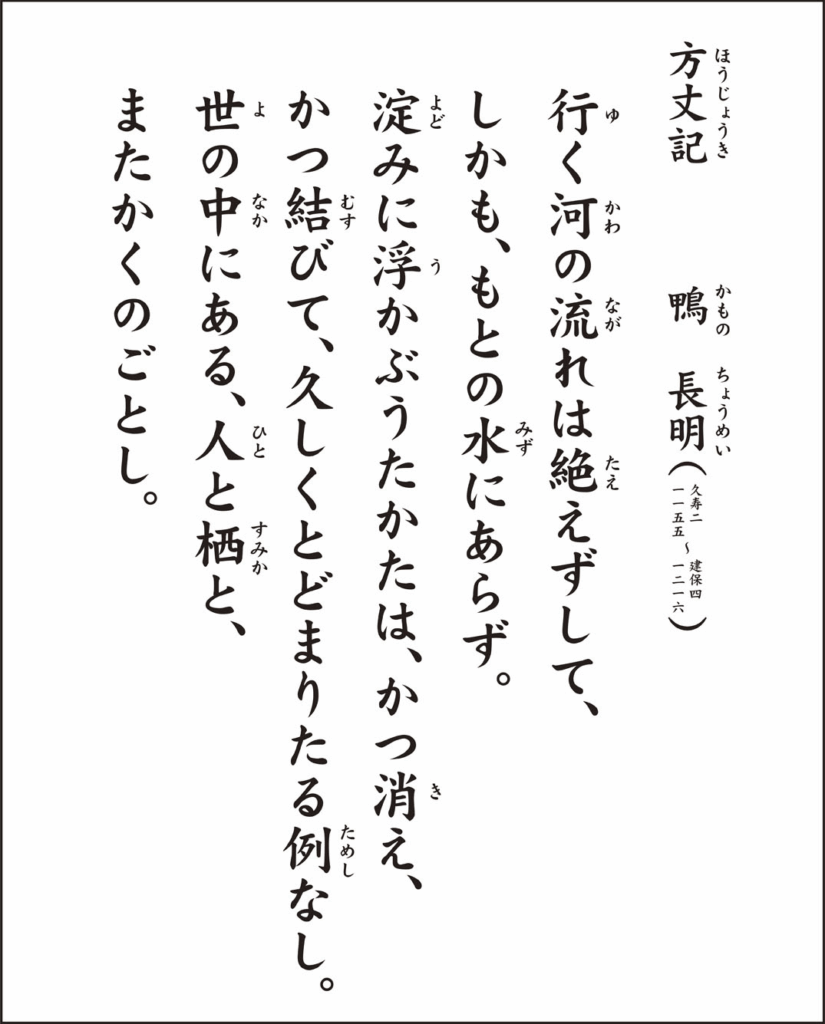 ゆく河の流れは絶えずして、しかももとの水にあらず。よどみに浮ぶうたかたは、かつ消えかつ結びて、久しくとゞまりたるためしなし。世中にある人と栖と、又かくのごとし。