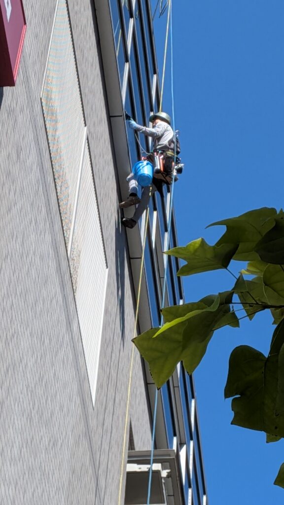 しかもこれは驚いた。紐にぶら下がって、窓の清掃をしているようだ。