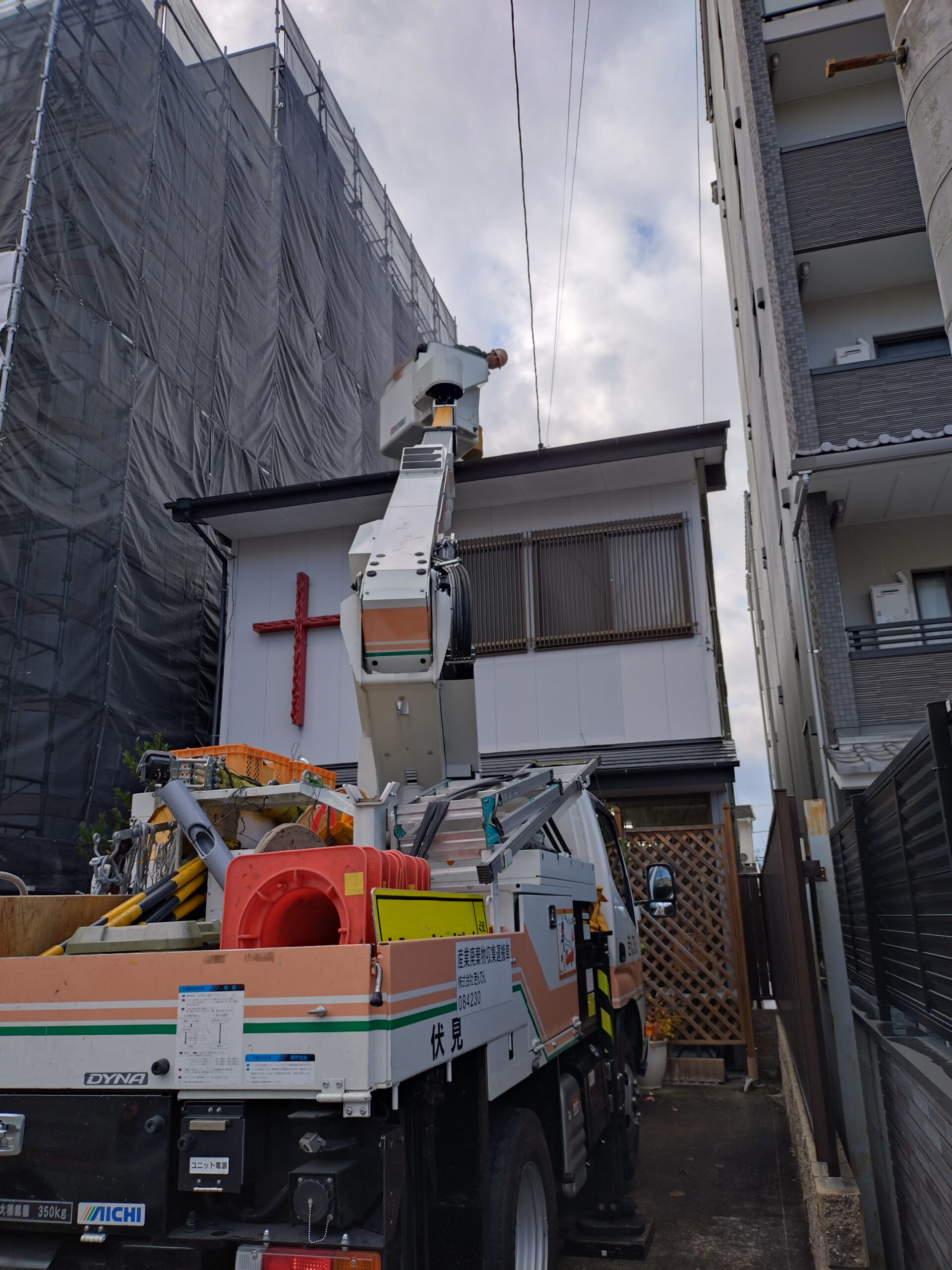 「働く車」というのは、幾つになっても興味深い。先日、教会の電気の引き込みの部分のコードが劣化して、漏電の危険があるということで、工事をしてもらうことになった。建物の中は一般の電気屋さんにしてもらえるのだが、電信柱からの引き込み部分は関電でなければできないということで、申請を出して依頼することになった。