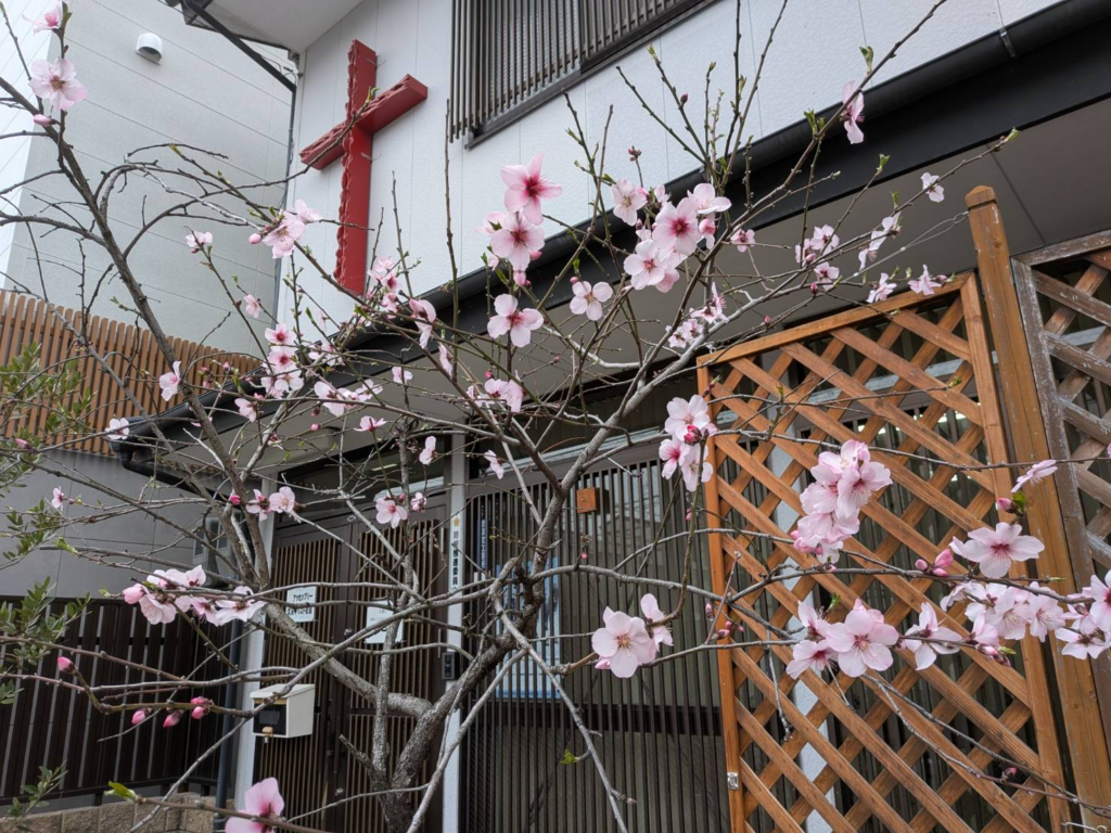 それから十年以上経って、伏見で開拓を始めた頃に、教会に花を植えたくて買って来たのが、このアーモンドでした。花壇の土が少ないせいかあまりたくさん花は咲きませんが、毎年花を着けてくれます。